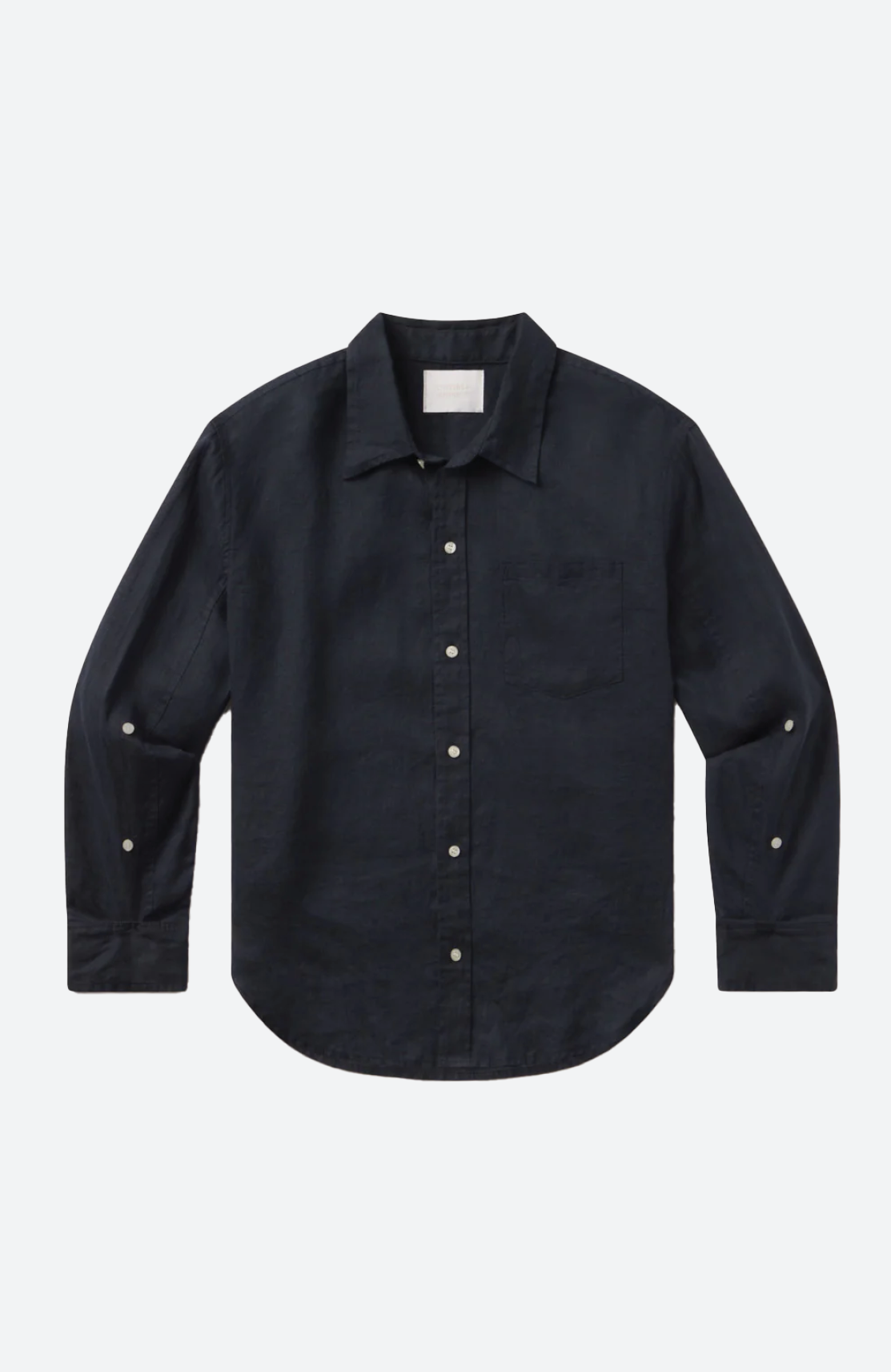 • Aussehen: Dunkelblaues Leinenhemd mit langen Ärmeln, Kragen und Knopfleiste