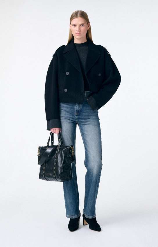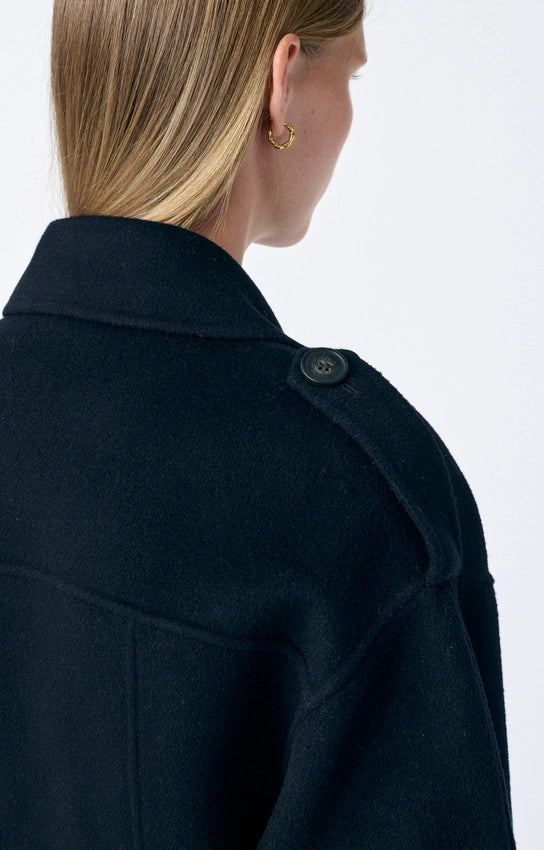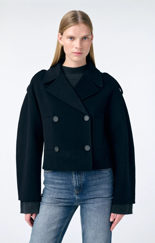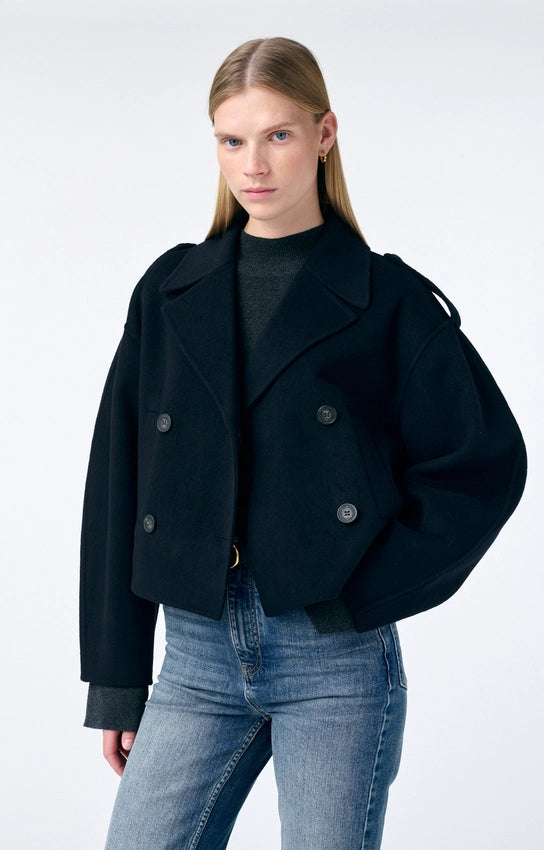 Der kurze, taillierte Mantel Beran aus dunkelbrauner Wolle ist perfekt, um Ihre modernen, lässigen Outfits aufzupeppen. Es verfügt über einen breiten Reverskragen und abgerundete lange Ärmel sowie Schulterklappen, die seiner Silhouette eine strukturierte Note verleihen. Der zweireihige Vorderverschluss verleiht dem Stück ein klassisches Element, während die diskreten und praktischen paspelierten Seitentaschen die schlichte Ästhetik des Mantels bewahren. Perfekt für die Herbst- und Wintersaison, verleiht es jedem Outfit einen Hauch von Raffinesse und sorgt gleichzeitig für angenehmen Tragekomfort.