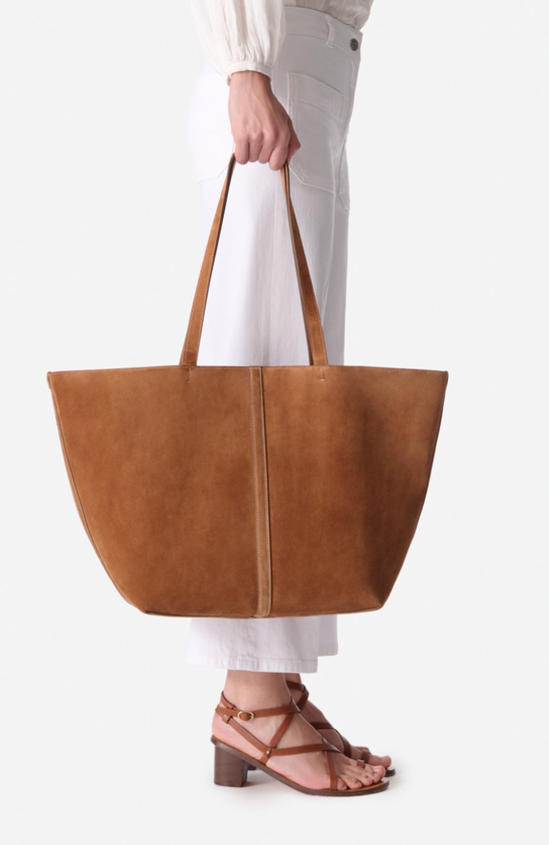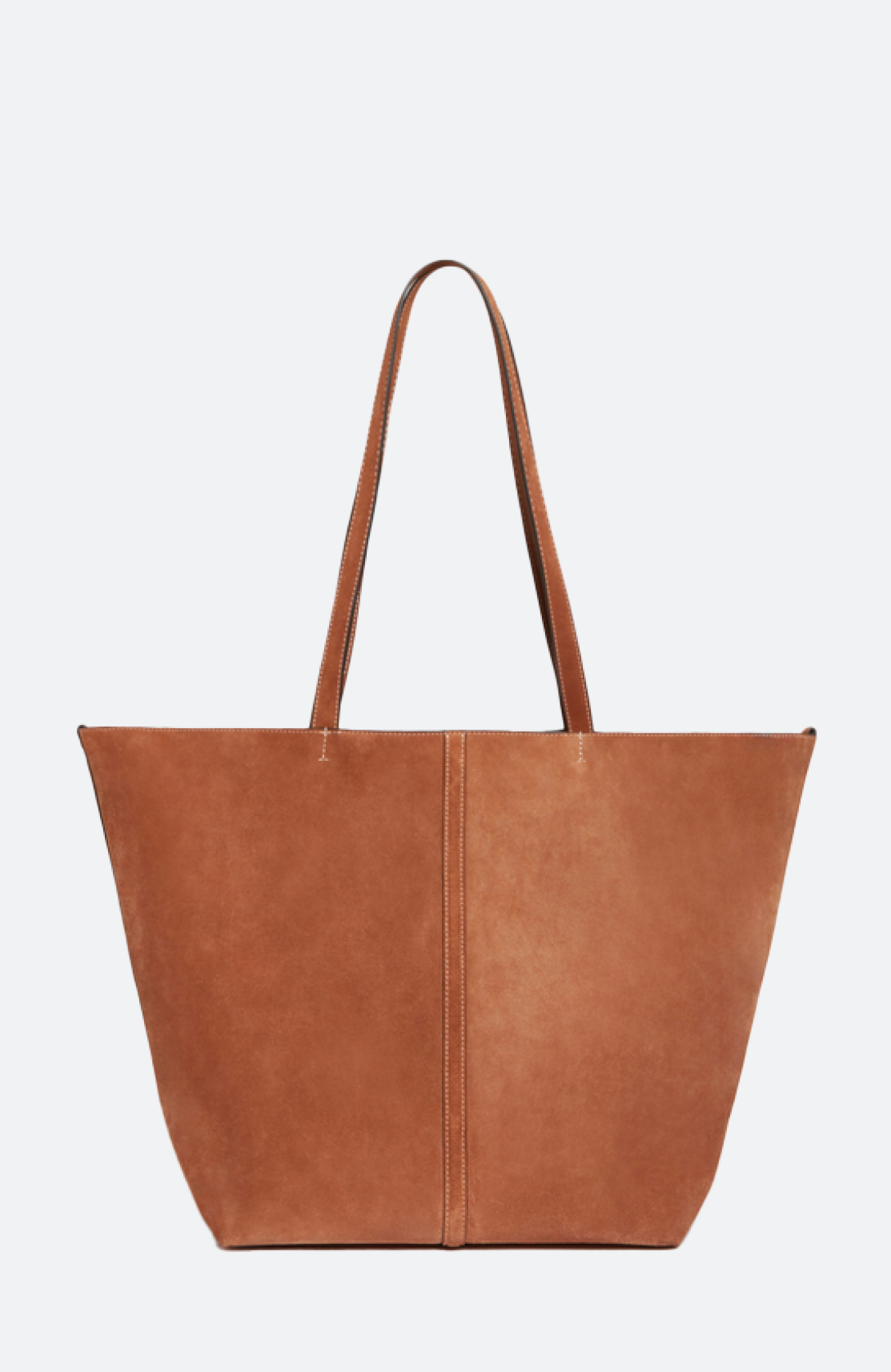 Die neue Ledertasche im Geiste der Daily Bag mit Velourleder, sichtbaren Nähten und Lederfalten. Seine Konstruktion ist auf das Wesentliche reduziert, um eine stromlinienförmige Silhouette zu schaffen, die mit einem goldenen Karabinerhaken geschlossen und entfaltet werden kann, um ein großzügiges Volumen freizugeben. Die verlängerten Griffe sind so konzipiert, dass Sie sie auch mit Mantel über die Schulter streifen können. Das kleine Extra? Sein Magnet sorgt für die sichere Aufbewahrung Ihrer wertvollsten Habseligkeiten.