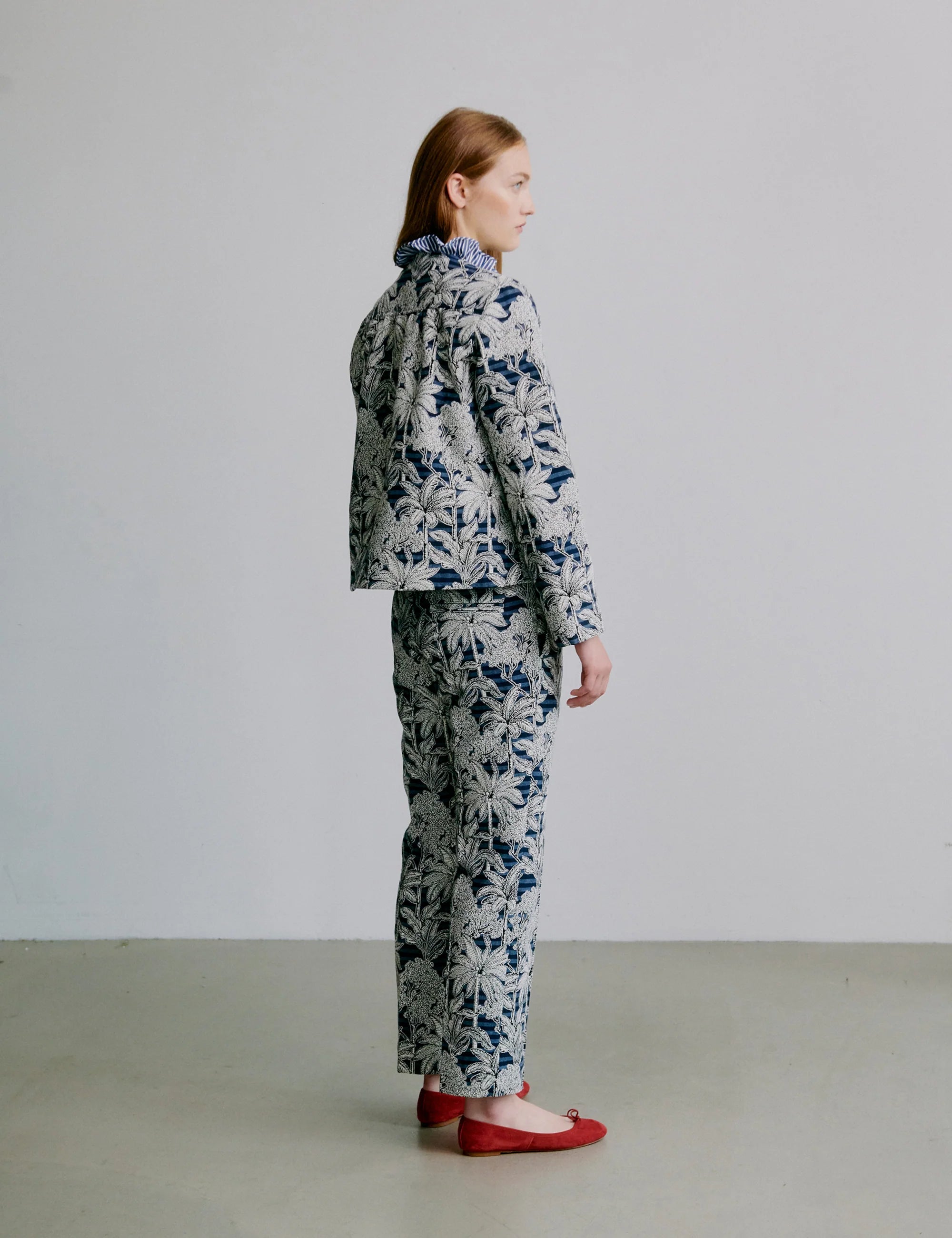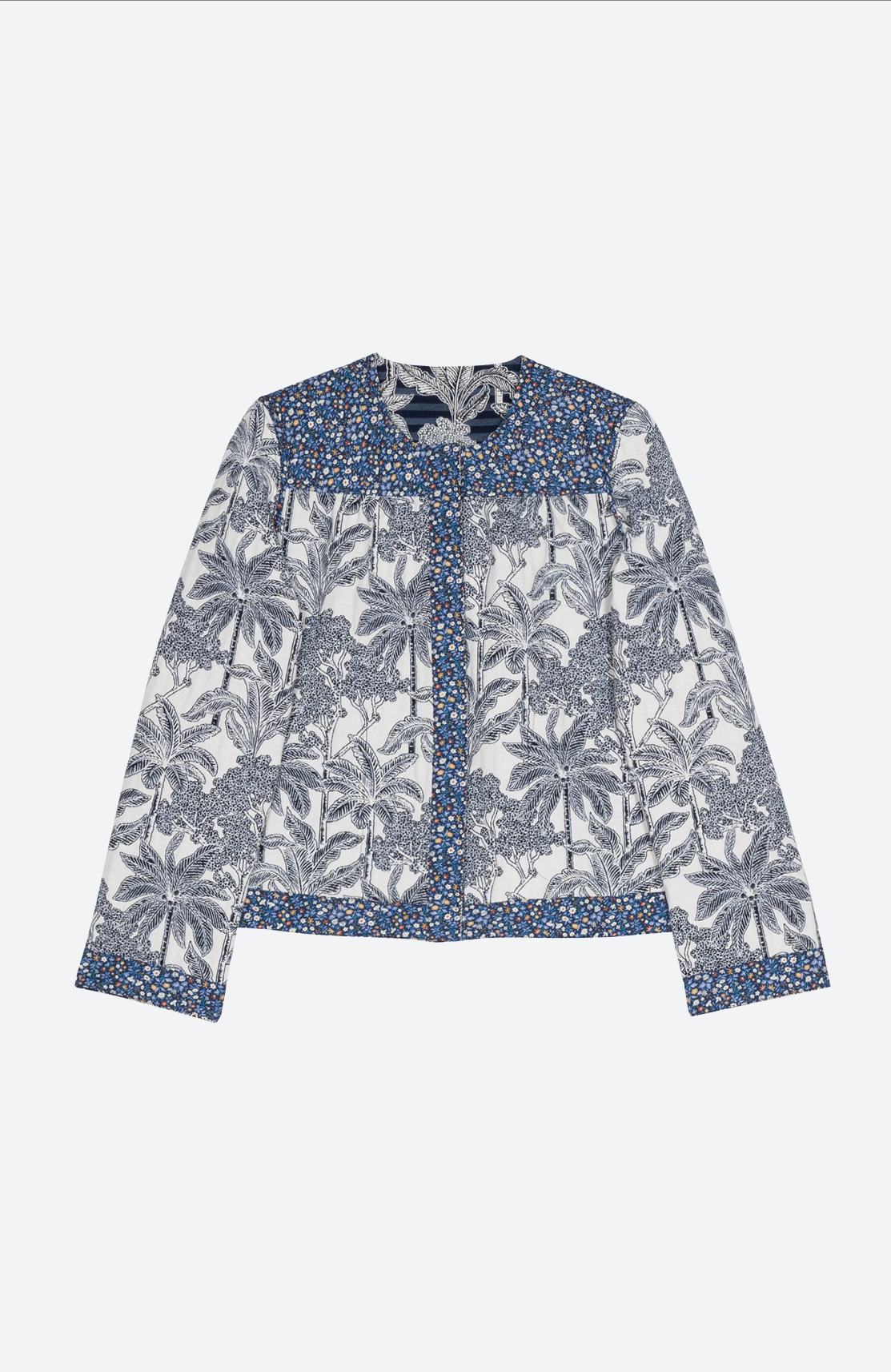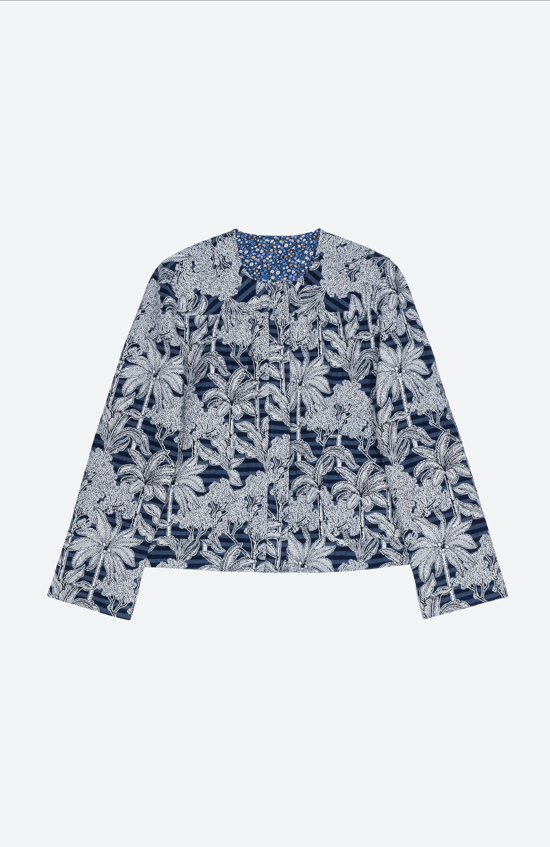 Die Rose Jacket in Blue Palm Escape ist wendbar und bietet somit zwei Looks in einem Design. Das markante Palmenmotiv trifft auf zarte florale Paspeln und schafft so eine raffinierte Balance aus Kontrast und Ruhe – eine Jacke, die gleichermaßen künstlerisch und zeitlos wirkt.