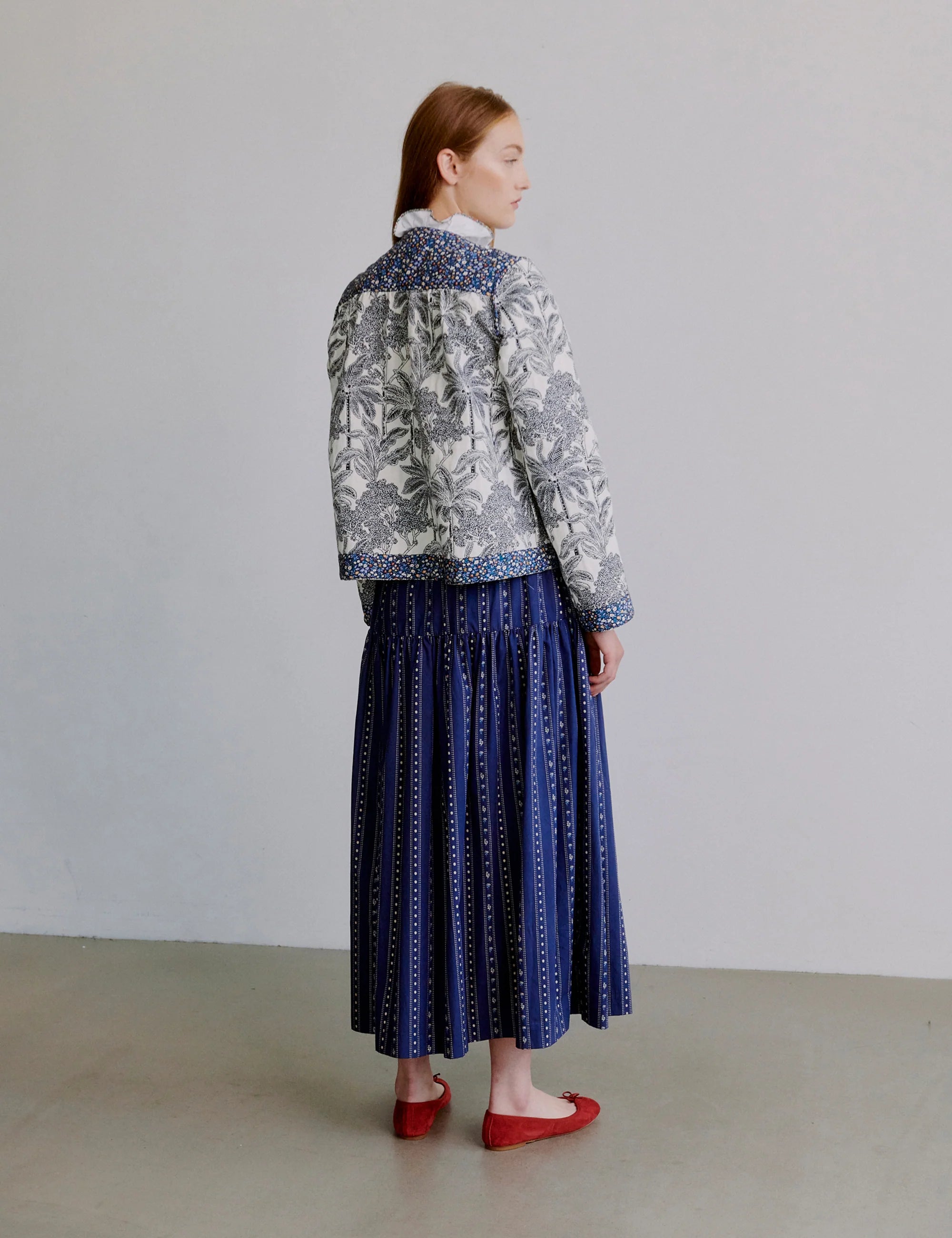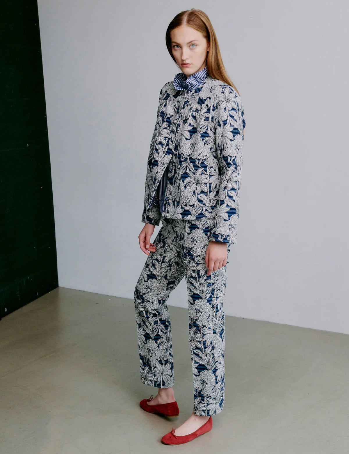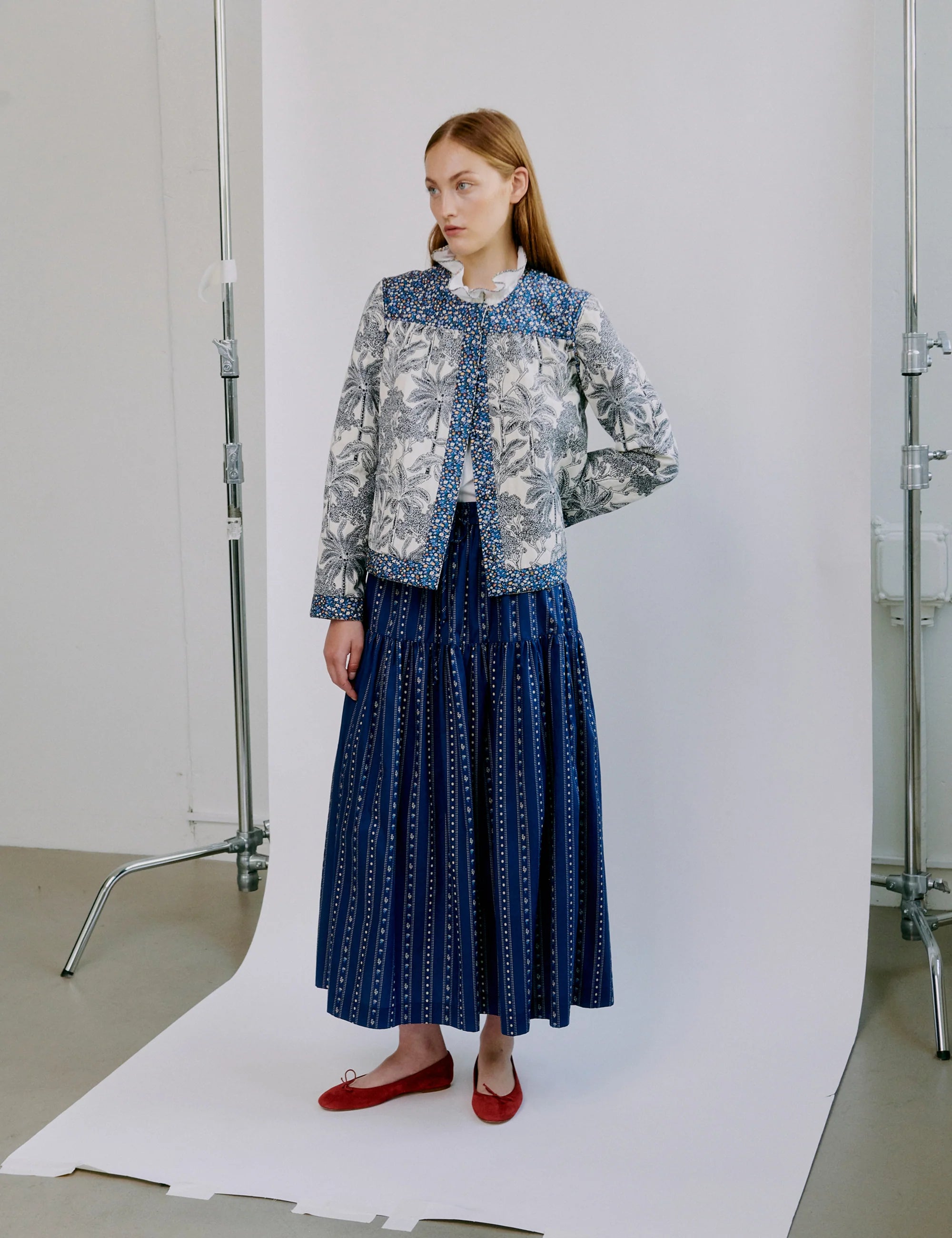 Die Rose Jacket in Blue Palm Escape ist wendbar und bietet somit zwei Looks in einem Design. Das markante Palmenmotiv trifft auf zarte florale Paspeln und schafft so eine raffinierte Balance aus Kontrast und Ruhe – eine Jacke, die gleichermaßen künstlerisch und zeitlos wirkt.