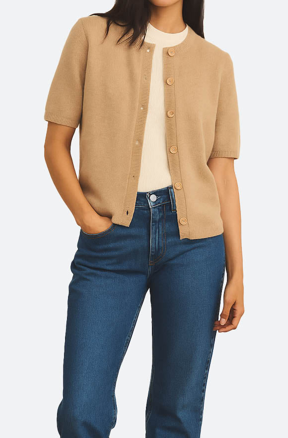 Der klassische Rundhalsausschnitt, die fein gerippten Abschlüsse und die durchgehende Knopfleiste mit sechs recycelten Ziegenhornknöpfen aus Italien unterstreichen den hochwertigen Look. Die Ärmel enden leicht oberhalb des Ellbogens – ideal für den Übergang oder als stilvolle Ergänzung für kühlere Sommerabende.