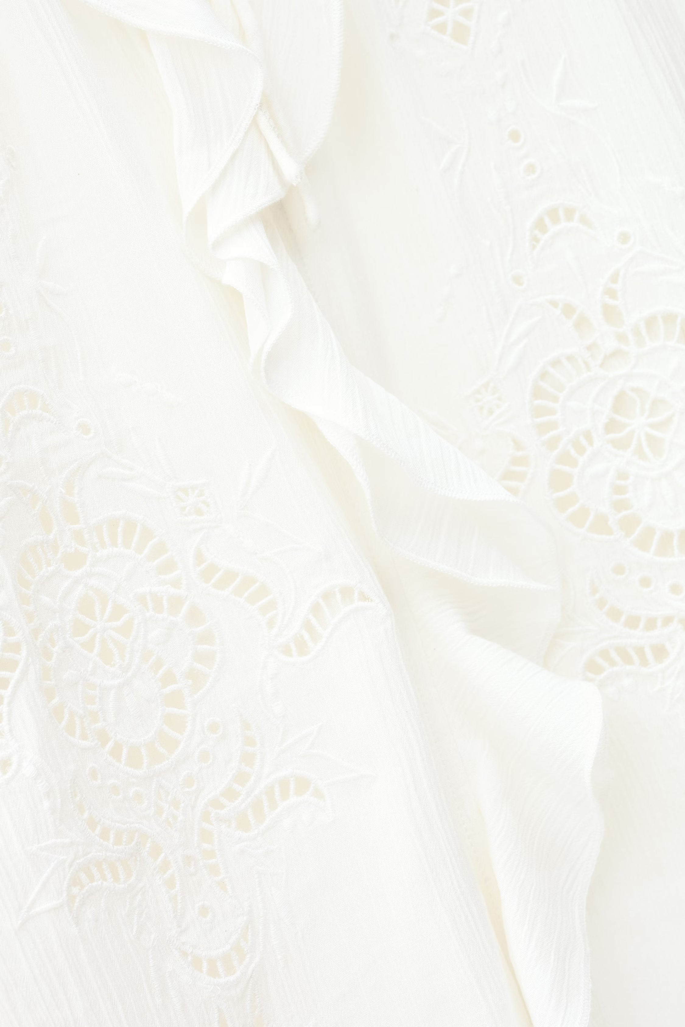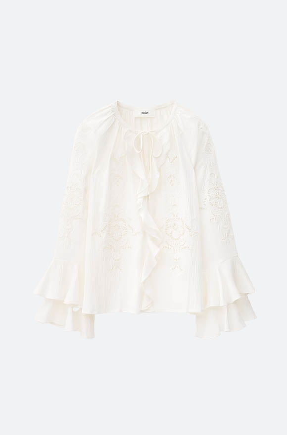 Die Flounced Omar Bluse von Ba&sh ist ein Key-Piece für alle, die romantische Details und französische Leichtigkeit lieben. Die Kombination aus floraler Lochstickerei, Rüschen und Volants macht sie zu einem echten Eyecatcher, der jedes Outfit aufwertet.