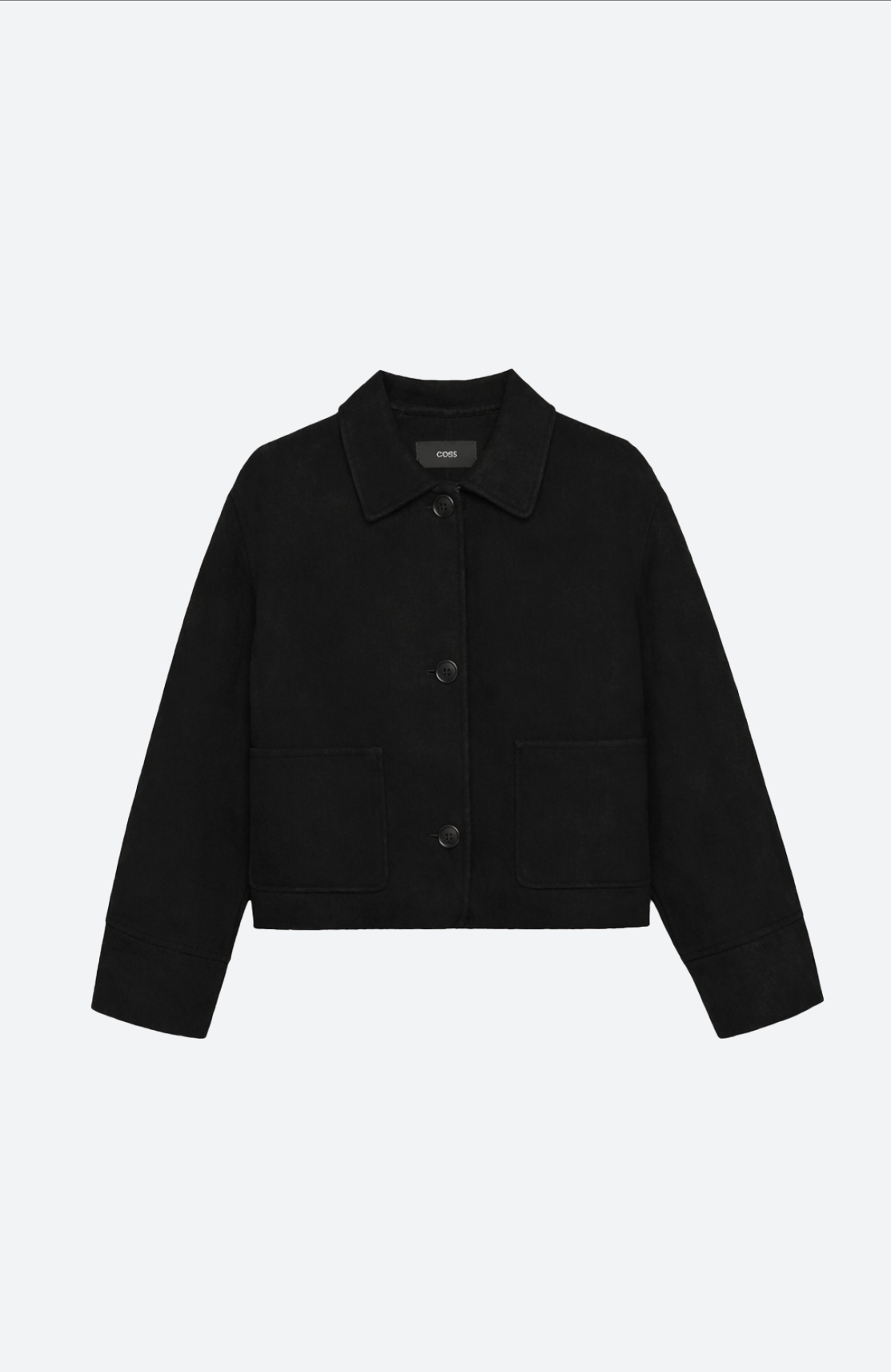 Diese kurze Wolljacke in schwarz überzeugt durch ihr minimalistisches Design und hochwertige Verarbeitung. Der klassische Umlegekragen, die dezente Knopfleiste sowie die klaren Linien verleihen der Jacke eine zeitlose Eleganz, die sich vielseitig kombinieren lässt.