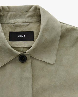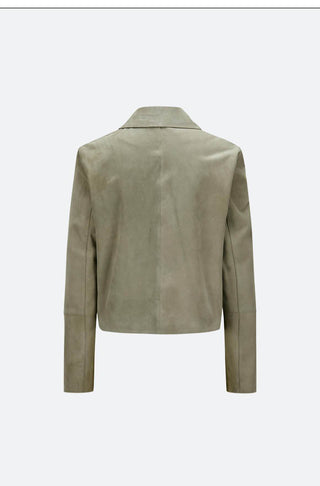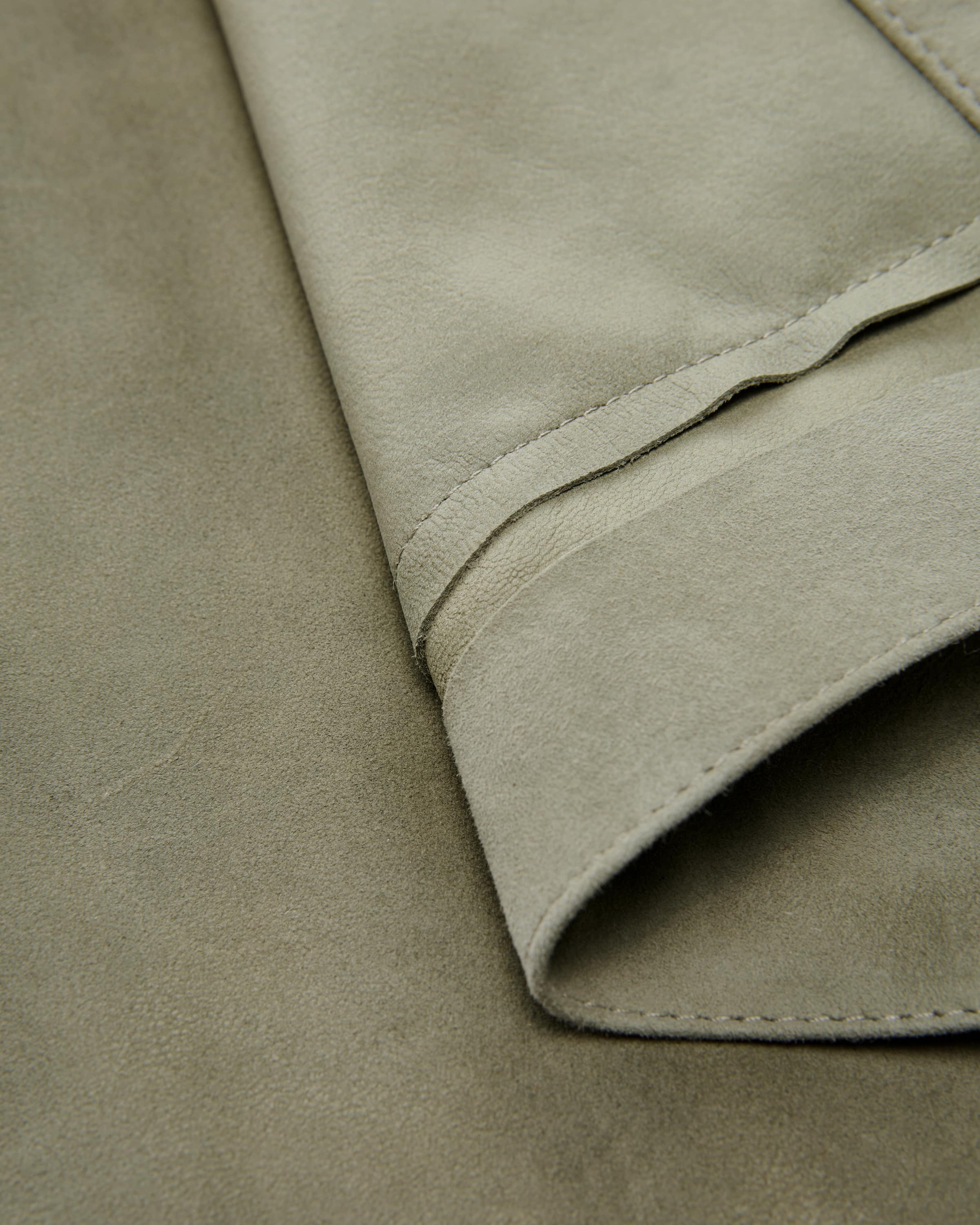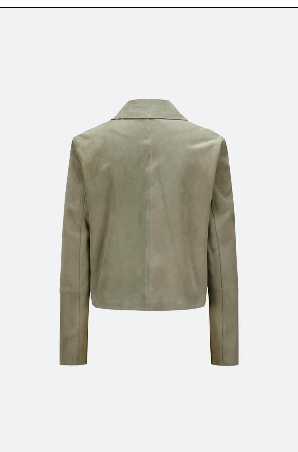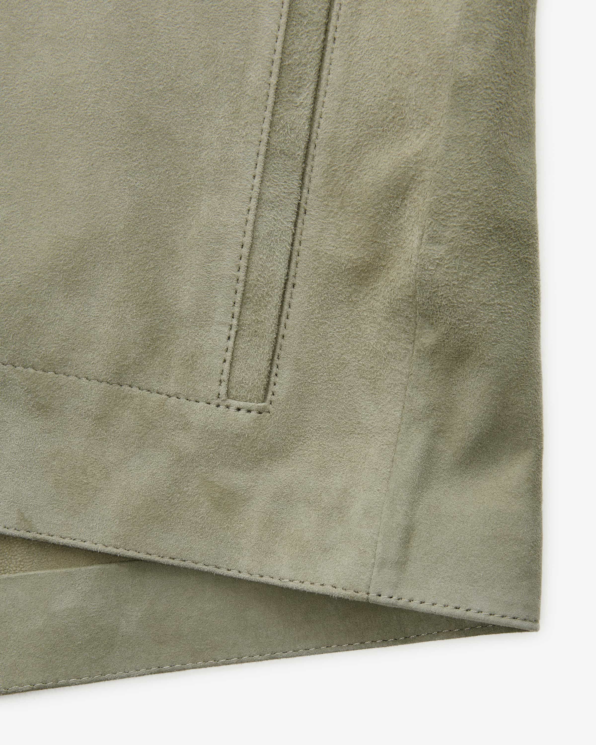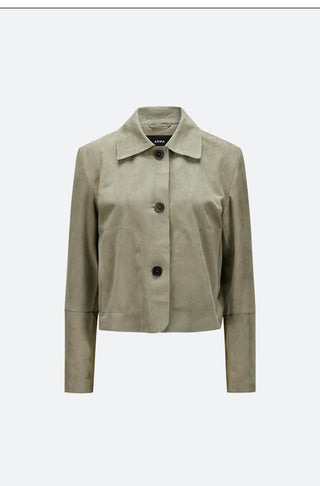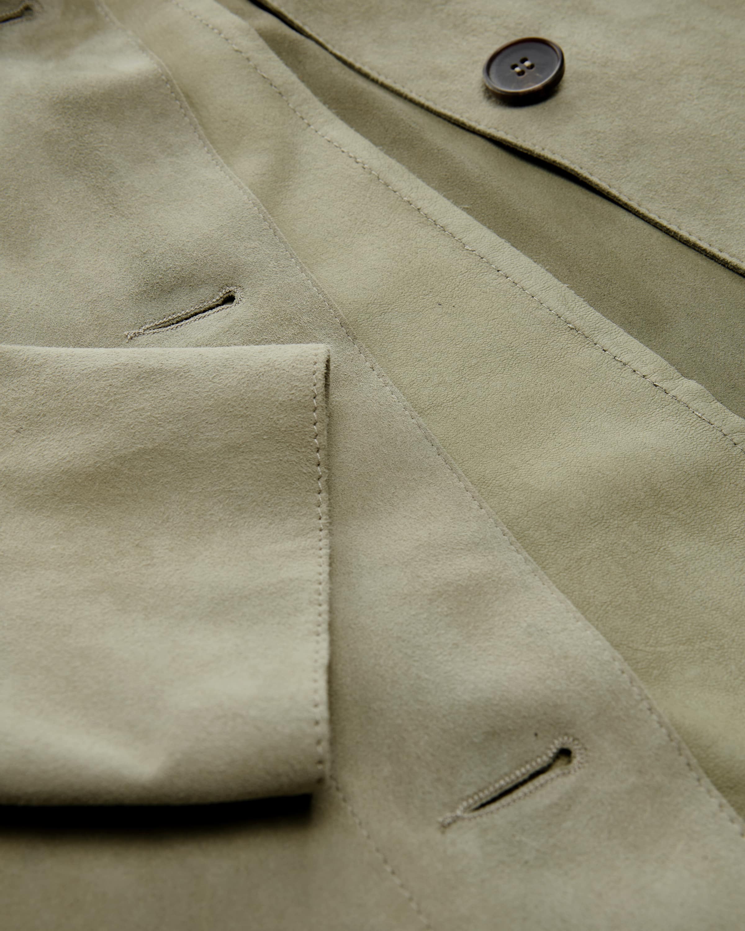 Diese Button-Down-Jacke aus Wildleder ist leicht verkürzt geschnitten und verfügt über einen Hornknopfverschluss und Vordertaschen. Die stromlinienförmige Silhouette und der spitze Kragen machen es schick und minimalistisch.