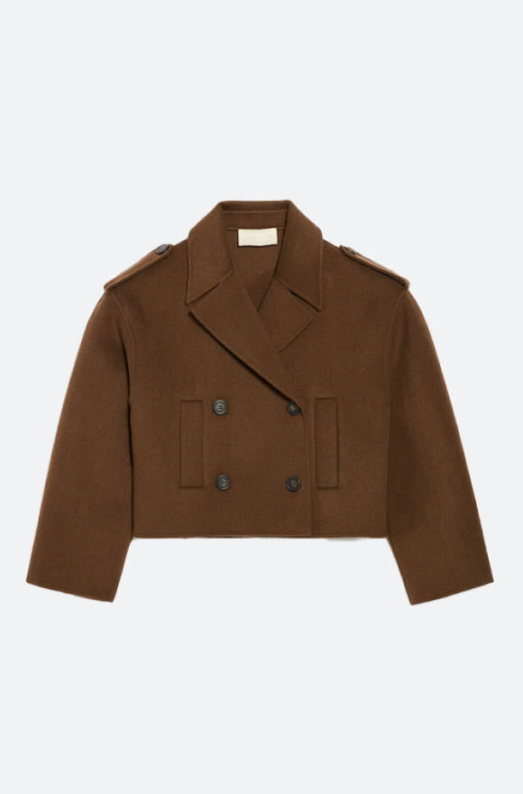 Der kurze, taillierte Mantel Beran aus dunkelbrauner Wolle ist perfekt, um Ihre modernen, lässigen Outfits aufzupeppen. Es verfügt über einen breiten Reverskragen und abgerundete lange Ärmel sowie Schulterklappen, die seiner Silhouette eine strukturierte Note verleihen. Der zweireihige Vorderverschluss verleiht dem Stück ein klassisches Element, während die diskreten und praktischen paspelierten Seitentaschen die schlichte Ästhetik des Mantels bewahren. Perfekt für die Herbst- und Wintersaison, verleiht es jedem Outfit einen Hauch von Raffinesse und sorgt gleichzeitig für angenehmen Tragekomfort.