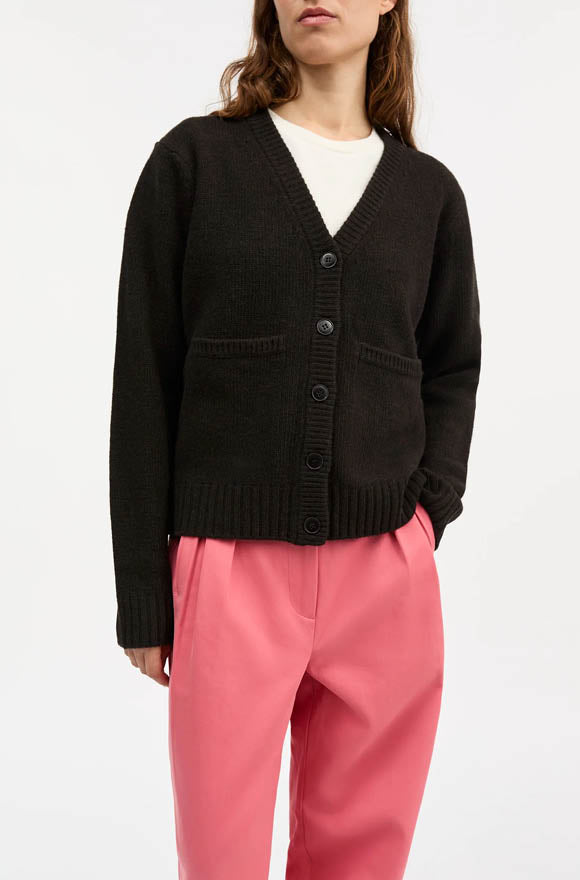 Der Beti Cardigan besteht aus 100 % Merinowolle und hat überschnittene Schultern sowie einen klassischen V-Ausschnitt mit fünf Knöpfen. Halsausschnitt, Saum, Bündchen und die beiden aufgesetzten Taschen vorne sind gerippt.