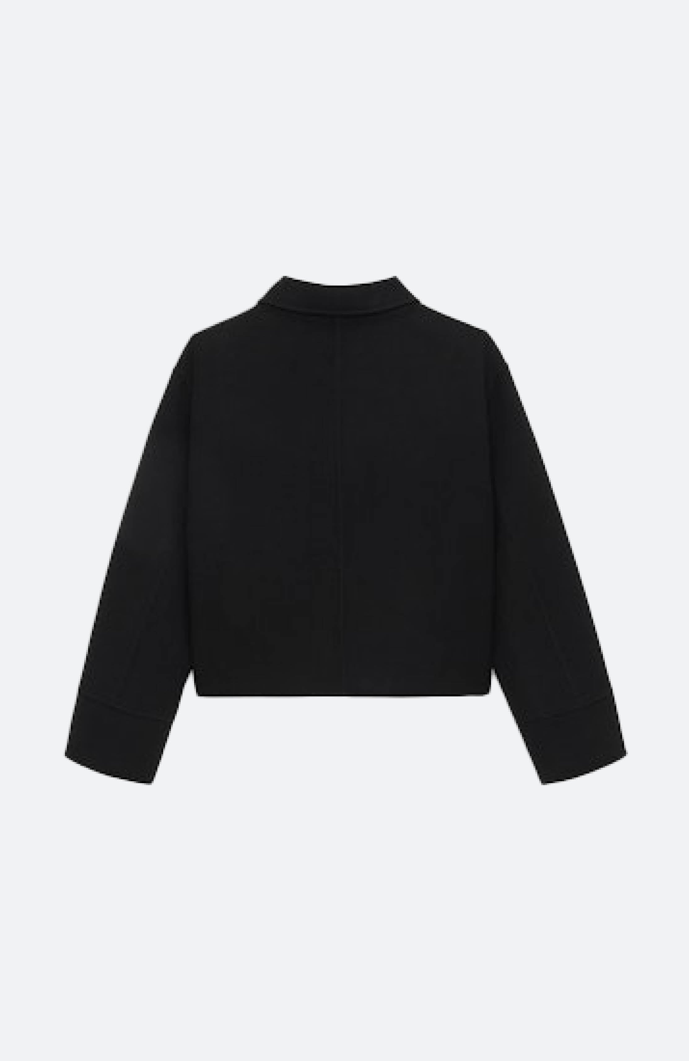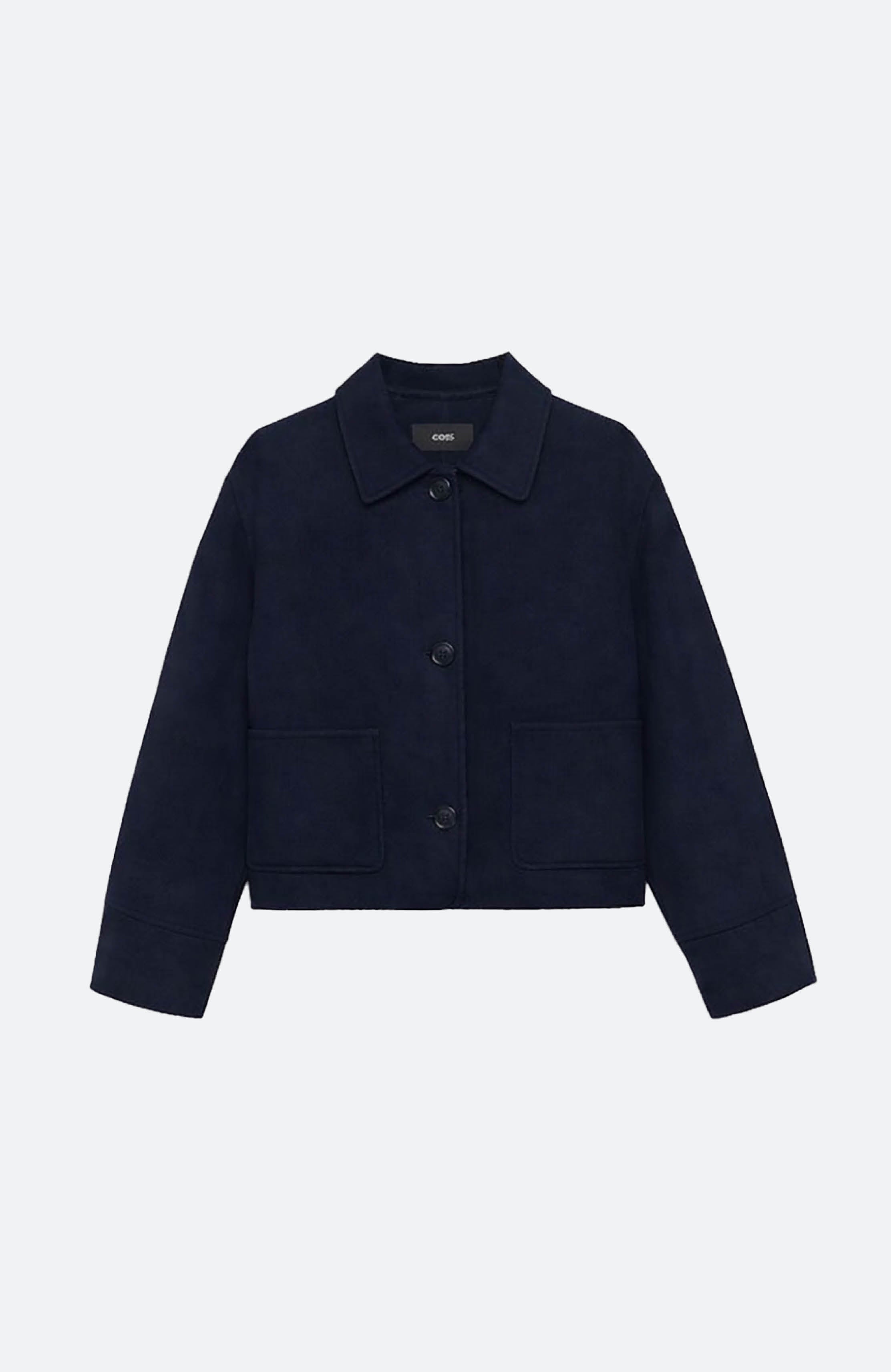 Diese kurze Wolljacke in tiefem Dunkelblau überzeugt durch ihr minimalistisches Design und hochwertige Verarbeitung. Der klassische Umlegekragen, die dezente Knopfleiste sowie die klaren Linien verleihen der Jacke eine zeitlose Eleganz, die sich vielseitig kombinieren lässt.